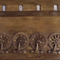 Réplique des premières machines à calculer construites par Blaise Pascal, pour l'addition et la soustraction. Années 1640. Elle comprend quatre pieds détachés en bois TM21265:b. Avec huit roues pour un maximum de 999 999 livres, 19 sols et 11 deniers.